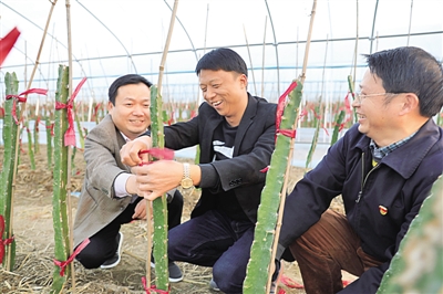 在“不忘初心、牢记使命”主题教育中,江西省高安市积极帮助群众发展脱贫致富产业,并为他们送去政策、信息和技术,全市形成蔬菜、果业、茶叶和中草药四大特色种植产业,总面积达40万亩,总产值突破10亿元。图为挂点帮扶党员在该市祥符镇杉林村火龙果种植基地了解情况。李莉摄/光明图片