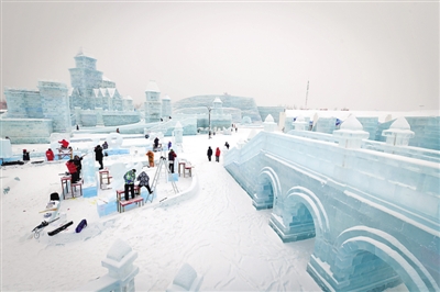1月7日,在哈尔滨冰雪大世界园区举行的第三十四届中国哈尔滨国际冰雕比赛进入第二天,参赛的冰雕作品已“芳容”初现。图为参赛者在进行冰雕创作。新华社发