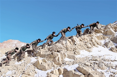 新春,忠诚守护家园的人民子弟兵,把青春融进祖国的山河。图为1月24日,新疆军区河尾滩边防连官兵手牵手向巡逻点位前进。新华社发