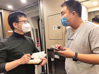 与以往出差不同,这一次,我们在列车上就开始采访。在这武汉之行的起始,就让我们抓到了一些真实的感动。在南行的列车上,我们遇到了同行苏洲,他的母亲是医生,给他发来一段视频,教他如何戴口罩,如何洗手,这位从除夕开始一直在工作没有休息的记者,看到视频眼圈都红了。采访列车保洁员甘大姐时,她真诚地对我们说:“我们做的事不算什么,不要关注我,多采访一些去武汉一线的人。”