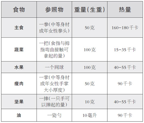 先来看看该如何“丈量”食物。首先,我们要养成看食物包装上食物成分表的习惯。一般上面都会注明食物所含的热量是多少,这样就很容易估算出我们摄入的热量。而对于那些没有标明热量的食物,《2016版中国居民膳食指南》特别提出“食物标准份量”的概念,从“量化”到“形象化”,让大家更容易把握食物用量和平衡膳食。我们可以借助生活中常见到的物品作为参照物,来衡量我们吃的食物。最简单的方法,可以借助中等身材成年女性的手、瓷勺、网球等。