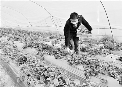 在疫情低风险区,农户们加紧复工复产,通过电商渠道加快新鲜水果的采摘、包装和销售。图为江苏省海安市高新区韩庄村某草莓园负责人张行来抓紧采摘新鲜草莓。顾华夏摄/光明图片