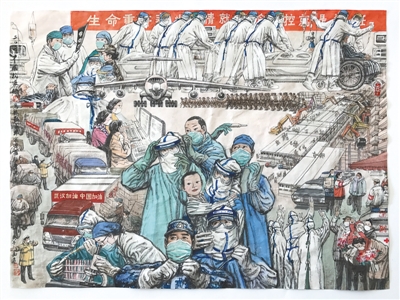 冯远院长创作的《二〇二〇中国抗疫》,采取宏阔的时空视角,撷取多组典型抗疫场景组合,描绘并塑造生动的人物群像,寓意众志成城、守望相助,体现“疫情无情、人间有爱、珍重生命”的大爱主题。上海美院诸多师生积极投入此次意义非凡的创作之中,本刊所选为其中一些代表:毛冬华、潘文艳、贺兰山、王冠英、曹炜、李戈晔、周隽、徐亮、李根等师生,积极担当,他们对典型细节、场景道具细致研读,提炼艺术形象,完成心力之作,确保创作中艺术性与思想性深度融合。这次创作对他们而言,也成为一次生动有益的主题性创作实践案例。