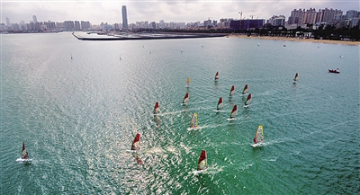 3月3日,正在海口备战奥运的国家帆船帆板队队员和集训中的部分省队队员在海口西秀海滩海域开展RS:X级、激光雷迪尔级、470级等帆船帆板项目训练。图为队员在进行470级帆船训练。新华社记者 杨冠宇摄