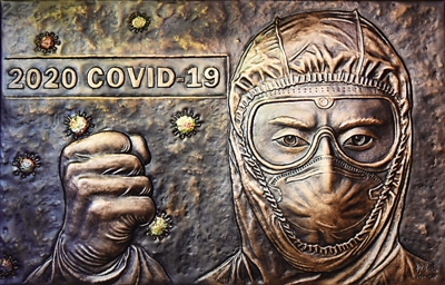 紧握的拳头、坚毅的眼神,手工捶打100个小时锻造的彩铜浮雕作品,表现出主动请缨的白衣战士用实际行动缔造“最美逆行者”这一响亮的名字。中华民族,何尝不是在这样一次次的锤炼中愈加坚强,走向胜利。