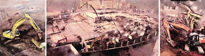 我们选择了火神山医院建设工地这样一个较大场景来进行创作。夜间施工,灯光与工地上劳动的热情交相辉映,表现了建筑工人在危急时刻,夜以继日用自己的辛勤劳动投入到工程建设中的感人场景。这样的题材表现了无与伦比的“中国速度”。