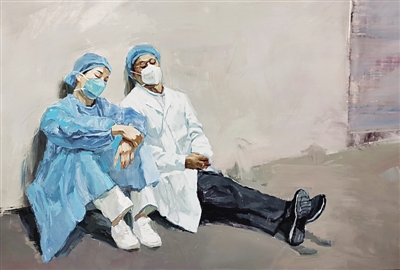 医护人员抢救病人后,因连续加班太过疲惫,在病房过道睡着了。作品以此反映医护人员的辛劳和敬业精神,表达对他们的敬意。