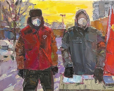 此外,以“社区防疫”为主题的美术创作都将视线聚焦在了我们身边的平凡岗位上,是疫情期间人们日常生活的最真实写照,因而更容易引起观者的共鸣。无论是张龙的《抗击疫情》中正在对垃圾桶进行消毒的熟悉背影,还是丁平的《坚守》中执勤守岗的温暖面孔,抑或是陈立天的《社区抗疫情》里清洁工、志愿者、保安人员的忙碌身姿,这些画中人似乎就在我们身边,时常与我们擦肩而过,他们是这场没有硝烟的战争中的一个个小小的身影,但却为社区疫情防控筑起了牢不可破的铜墙铁壁。