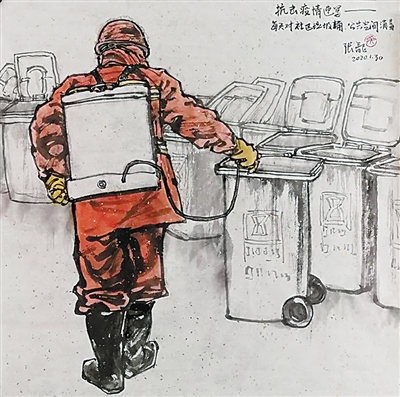 “社区工作人员用着最简单的防护用品,尽心尽责地承担着防疫工作,每每深夜仍然坚守在社区出入口,把守着社区居民的健康大门。所以,除了积极配合他们的工作,我更希望用画笔记录下这些让我动容的画面,向他们致敬。”画家戴树良告诉记者,他所居住的成都某小区在疫情期间一直采用凭证出入的方式进行管理,普通居民持蓝色出入证,刚从外地返蓉的小区居民持黄色临时证件,居家隔离14天后再更换为蓝色,出入证上更是标注了社区疫情防控热线和防疫小常识,其用心程度可见一斑。戴树良的系列作品《抗疫,社区在行动》选取了“张贴宣传海报”“测温登记”“环境消毒”“上门排查”等主题,以中国画的形式生动展现了社区防疫的方方面面。