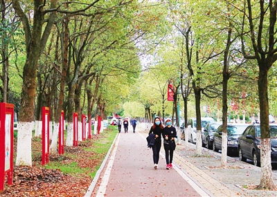 市民惬意地漫步在沿江路人行道上。廖海金摄/光明图片