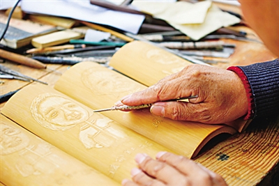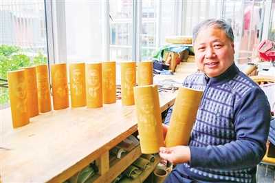 3月31日,江苏省如皋市磨头镇,非遗南通永泰竹刻传承人杨林才在对竹刻作品《如皋支援武汉11名医务人员》做整理工作。据了解,这组作品将在今年该市“五一”表彰大会上赠送给这11位支援武汉的医务人员。徐慧摄/光明图片