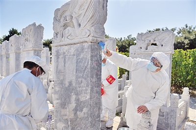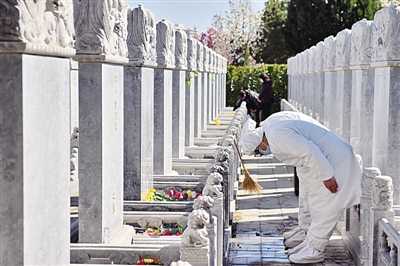 北京八宝山人民公墓工作人员在擦洗墓碑。新华社记者 彭子洋摄