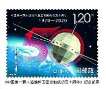 2020年4月24日,中国邮政发行一枚《中国第一颗人造地球卫星发射成功五十周年》纪念邮票,主图为红色数字“50”,在“0”的中心是“东方红一号卫星”,背景为深蓝色星空下浅蓝色的地球以及火箭腾空的画面,突出了“东方红一号卫星”成功发射五十周年的主题。这是“东方红一号”卫星第二次绘入中国邮票。