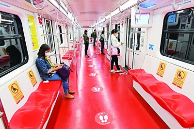 近日,意大利米兰的地铁车厢内增贴了一系列标识,提醒乘客在车厢内保持社交距离,避免新冠病毒的传播。图为4月29日,在意大利米兰,乘客们戴着口罩保持距离乘坐地铁。新华社发