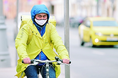 据俄罗斯防疫指挥部30日消息,过去24小时俄新增新冠确诊病例7099例,累计确诊106498例。图为4月30日,在俄罗斯首都莫斯科,一名送餐员骑车经过。 新华社发