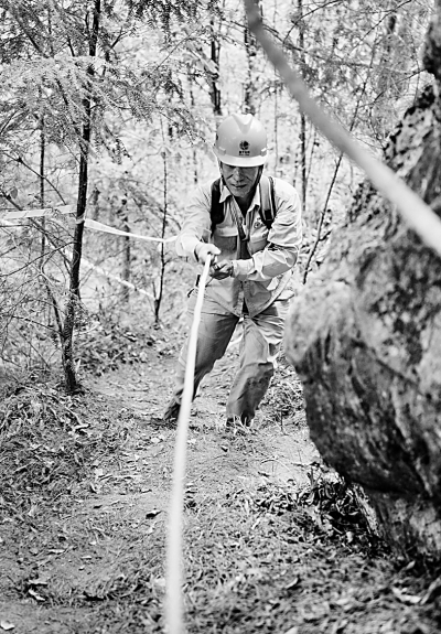 穿越秦岭腹地高山大岭的青海-河南±800千伏特高压直流输电工程,是我国第一条专为清洁能源外送而建设的特高压通道。秦岭腹地所有的施工现场地形均为高山大岭,最高海拔2450米,施工人员进入施工现场平均需要爬山2小时以上。图为4月30日,一名施工人员借助绳索爬行到工地。新华社记者 陶明摄
