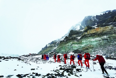 日前,自然资源部会同外交部、国家体育总局和西藏自治区政府组织开展2020珠峰高程测量工作。今年是人类首次从北坡成功登顶珠峰60周年、中国首次精确测定并公布珠峰高程45周年,开展此次珠峰高程测量具有重要的历史意义。图为5月7日,2020珠峰高程测量登山队前往海拔6500米的前进营地。