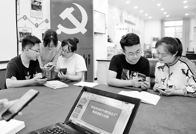 江西南昌西湖区给全区党员干部定制了电子版“学习书包”,推动党员干部线上学习。图为6月25日,西湖区朝农街道的党员干部在一起交流“学习书包”使用心得,并将“线上”“线下”相结合,深入开展解放思想大讨论。陈文萍摄/光明图片
