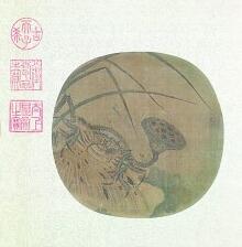 为此,北宋宫廷还圈养了诸多珍奇异兽、种植了各类奇花异草,以供宫廷画家写生创作,“皇家富贵”和“穷工极妍”的审美表达也由此形成,其中尤以黄筌及其次子黄居寀为代表。黄居寀的传世之作《晚荷郭索图》(北宋,绢本设色,纵23.9厘米,横24.7厘米),就是表现荷花题材的典型代表作,虽然该作品并没有完全传达出“极妍”的审美特点,但是画面“穷工”的写实特征却表现得淋漓尽致,附于荷叶上的蟹爪茸毛、动态十足的螃蟹形象,莲蓬凸出的莲子、枯黄的荷叶,都衬托出了秋季的萧瑟和冷寂,《东斋记事》评其为“观其神俊,以模写之,故得其妙”。传为南宋吴炳的《出水芙蓉图》(绢本设色,高23.8cm,长25.1cm,现藏北京故宫博物院),则完美诠释了“穷工极妍”的审美趣味,画面以写实的手法描绘了荷花雍容的外貌和怒放的姿态,笔法工细、设色艳丽,又以晕染的手法将荷花从荷心的淡雅素净延伸到花瓣尖端的浓烈姣妍,以娇嫩明净的色彩传达出了荷花干净的气质。