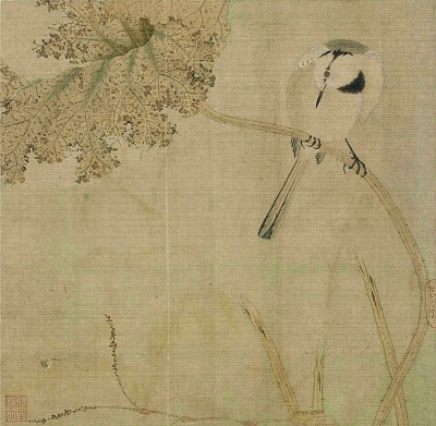 宋代在“穷工极妍”宫廷富贵气息的核心审美趣味之外,还有“徐熙野逸”的审美表达。如原载于《宋人集绘册》,后收录于《石渠宝笈三编》的佚名《枯荷鹡鸰图》(宋代,佚名,绢本设色,纵26厘米,横26.5厘米,藏于北京故宫博物院),画面表现的是秋冬季节荷塘中仍然矗立着的一截枯枝断茎,其上支撑着一片残败的荷叶,以及呈摇摇欲坠姿态站立于枯枝上的鹡鸰。此作品一反“极妍”的色彩表现,转而以素淡的笔墨表现为主,以“墨分五色”来建构画面的色彩构成,以此形成疏密有致、动静结合的审美效果。