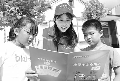 8月9日,志愿者在河北曲周县安寨镇前衙村为孩子们讲解安全用电“三字经”。暑假期间,国网曲周县供电公司组成党员志愿服务小分队,深入农村开展“安全用电伴我行”志愿服务活动,向农村儿童普及日常安全用电常识。新华社记者 朱旭东摄
