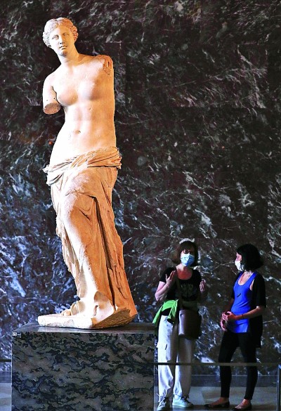 美国约翰斯·霍普金斯大学发布的新冠肺炎疫情最新统计数据显示,美国累计确诊病例已超过500万例,全球超过2000万例。图为7月6日,在法国巴黎卢浮宫博物馆,人们佩戴口罩参观雕塑《断臂维纳斯》。新华社记者 高静摄