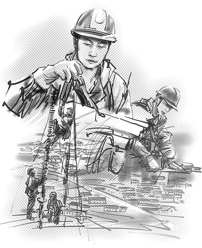 就个人条件而言,胡洪炜一米八的身高其实并不适合带电作业,但三年军营练就的结实精壮以及先天的敏捷机灵完美地补充了身高的短板。多年之后,闫旭东依然清晰地记得徒弟曾经带给他的震撼。带电作业两大危险,一是高空,一是带电。软梯是电力人得以骞翮远翥的依傍,可攀爬软梯却一度打湿了胡洪炜振翅欲飞的翅膀。新员工入职培训的训练场上,别人用一个月已经熟练掌握了技巧,笨鸟胡洪炜却刚刚及格。气喘吁吁地爬到基塔的顶端,将自己蛰伏在离地面几十米高的电线上,想像自己是一只俯瞰大地的鸟雀,一只暂时休整的雨燕,抑或是被印刷在音乐课本上的音符。音符在胡洪炜耳边轻声吟唱:我要飞得更高,更高!