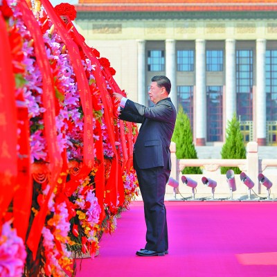习近平迈步上前,仔细整理花篮缎带。随后,习近平等党和国家领导人缓步绕行,瞻仰人民英雄纪念碑。