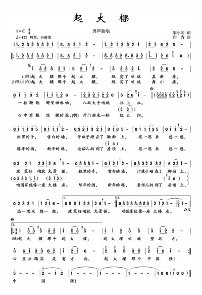 写农民盖房子并不稀罕。盖房子有很多道工序,宋小明选择了其中最重要、最有代表性的一个步骤——起大梁。对于砖木房来说,大梁至关重要。所谓“上梁不正下梁歪,中梁不正倒下来”,上梁即是大梁。起大梁往往要择吉日吉时。大梁起来之后,农民的感慨也就来了——“思一思来想一想,政策好咱就光景强”,毫无矫饰。由小家联想到国家——“咱国家就像一座大楼房”,毫不牵强。最后自然而然升华到“心里头踏实是有方向,起大梁那个中国强!”