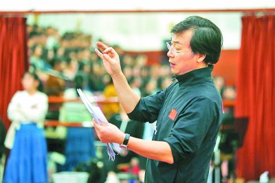 10月7日傍晚,廖昌永在排演中心指导学生排演第八段《祝捷》。“开心啊,祝捷啊,中间部分唱的不能太死板,要有欢快乐观的情绪。大家注意,革命的乐观主义精神,浪漫主义精神,战友间互相爱护的情谊始终贯穿……我们一起再试试看,一二三,走!”廖昌永为学生逐句逐音讲解示范。