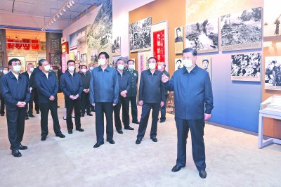 志愿军战歌的珍贵手稿,重现激战松骨峰场景的油画,反映鏖战长津湖、血战上甘岭等的景观,特级英雄黄继光牺牲处挖掘出来的爆破筒残体,缴获的武器装备,展现国内掀起参军参战支前热潮的历史照片,朝鲜停战协定签字仪式现场使用的文具,朝鲜人民欢送志愿军赠送的礼品,镌刻着抗美援朝英烈模范姓名的玻璃幕墙……丰富的历史文物、翔实的文献资料、新颖的展陈手段,吸引了习近平等领导同志的目光,他们不时驻足仔细观看,认真听取讲解,并详细询问有关情况。