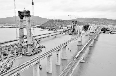 11月14日,由中国中铁大桥局承建的大跨度四线铁路高低塔双索面混合梁斜拉桥——新建福厦铁路乌龙江大桥首榀钢箱梁成功架设,标志着主跨达432米的新建福厦铁路乌龙江大桥全面进入上部结构施工。新建福厦铁路乌龙江大桥是新建福厦铁路全线关键控制性工程,大桥全长739.9米。新建福厦铁路设计时速350公里,预计2022年建成通车。新华社记者 林善传摄