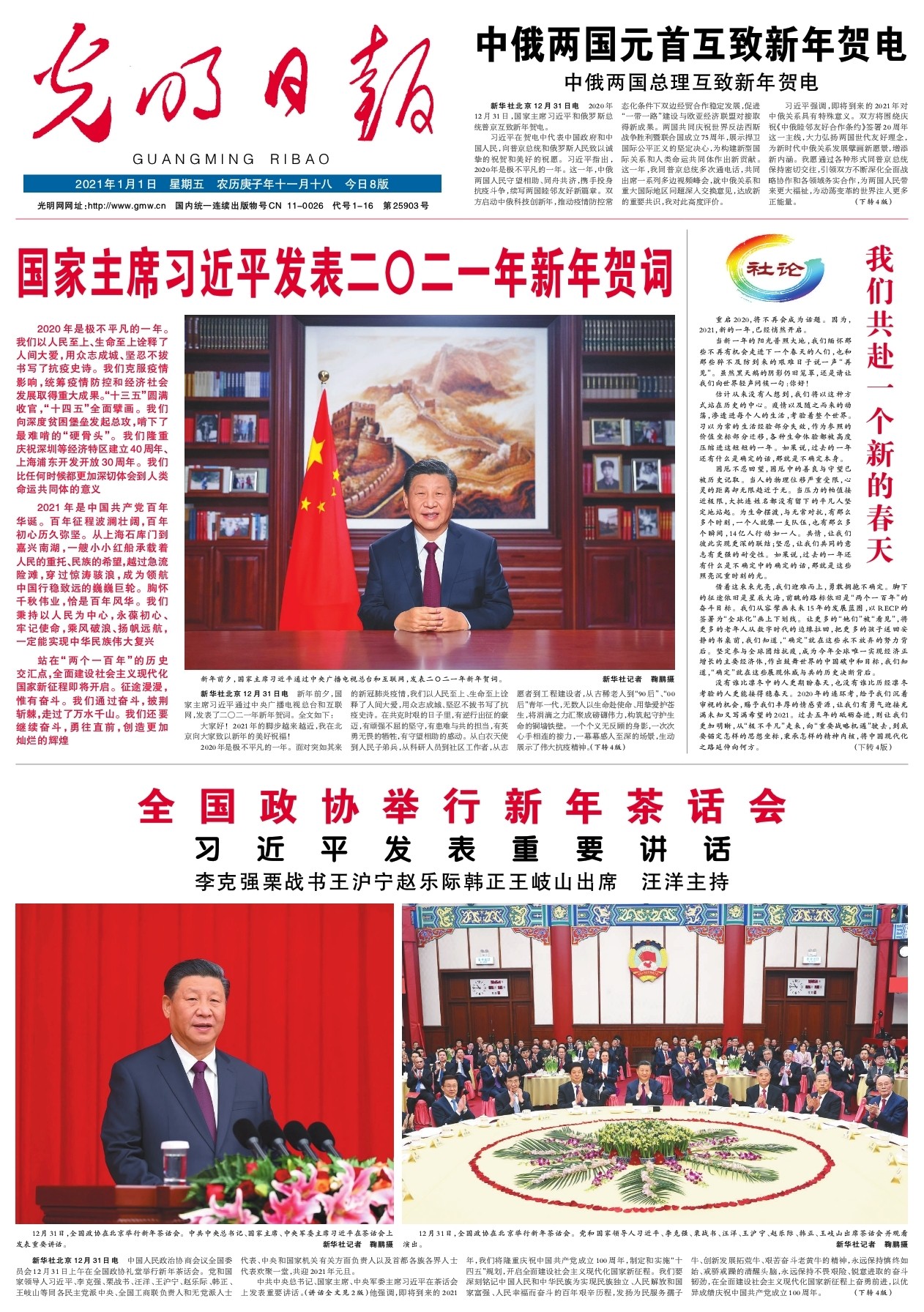 中共中央总书记、国家主席、中央军委主席习近平在茶话会上发表重要讲话。(讲话全文见2版)他强调,即将到来的2021年,我们将隆重庆祝中国共产党成立100周年,制定和实施“十四五”规划,开启全面建设社会主义现代化国家新征程。我们要深刻铭记中国人民和中华民族为实现民族独立、人民解放和国家富强、人民幸福而奋斗的百年艰辛历程,发扬为民服务孺子牛、创新发展拓荒牛、艰苦奋斗老黄牛的精神,永远保持慎终如始、戒骄戒躁的清醒头脑,永远保持不畏艰险、锐意进取的奋斗韧劲,在全面建设社会主义现代化国家新征程上奋勇前进,以优异成绩庆祝中国共产党成立100周年。