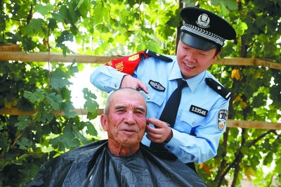 傍晚的新疆轮台县群巴克镇敬老院里,传来欢快的歌舞声。一群年纪不同,却穿着同样制服的民警,正为敬老院里的老人表演节目。坐在一旁的老人们有的拍手,有的欢笑,一派欢乐祥和的场景。