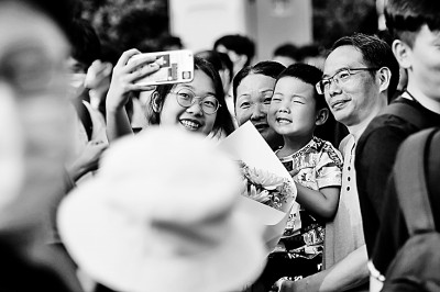 6月8日,考生和家人在安徽省合肥市五十中学天鹅湖校区考点外留影。
