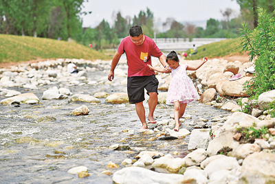 近年来,陕西西安在秦岭生态治理和推进全域治水的基础上,构建出一条条包含游径、绿化景观、休憩驿站、水利设施等系统工程在内的绿色长廊。图为5月29日,一名市民带着孩子在秦岭山脚下的休憩驿站“太乙驿”内亲水游玩。新华社发