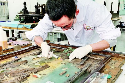 另一个方向是传世漆器文物的修复,按照《髹饰录》的记载,装饰工艺种类可以分为素髹、罩明、雕镂、戗划、描饰、斑斓等14类百余种。在各大博物馆中,故宫博物院收藏的传世漆器文物最多,其中器物部的库房就有近18000件,涵盖了典籍中记载的多数工艺种类,涉及日用家具、文房等器物,以及乐器、兵器、车马轿舆、建筑内檐装修等领域。漆器修复技艺作为一项非物质文化遗产,在故宫博物院的文保科技部传承有序,其整体的保护修复水平居国内外领先地位。