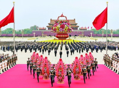 方阵前,以中共中央,全国人大常委会,国务院,全国政协,中央军委,各民主党派、全国工商联和无党派爱国人士,各人民团体和各界群众,老战士、老同志和烈士亲属,中国少年先锋队名义敬献的9个大型花篮一字排开,花篮红色缎带上书写的“人民英雄永垂不朽”熠熠生辉。