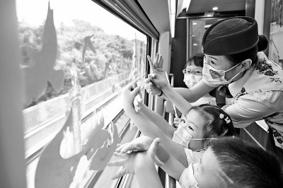 10月2日,G8612次高铁动车组上,乘务员和小朋友一起用国庆元素装扮列车车厢。包亮摄/光明图片
