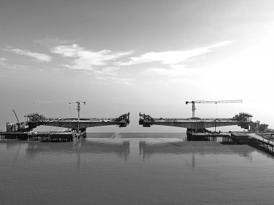 杭甬高速复线又称为杭绍甬高速,其建成通车后,将作为长江经济带战略的支撑项目,有力促进沿线区域的经济发展。图为11月20日,杭甬高速复线工程滨海高架桥施工现场。 新华社记者 江汉摄