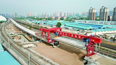 4月30日是“五一”假期第一天,中铁十局的建设者坚守一线,落实防疫措施抓生产,完成了山东济南黄台联络线最小曲线半径双线箱梁架设节点性工程任务。黄台联络线工程建成后,将实现济南枢纽内京沪高铁、石济客专、济郑高铁、济青高铁四大高速铁路网客运车站互联互通。新华社记者 郭绪雷摄