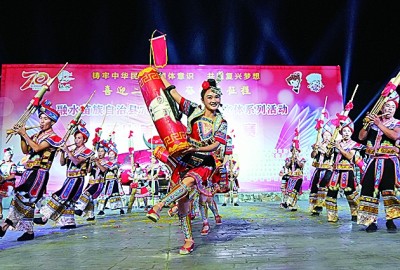 9月25日,广西柳州市融水苗族自治县举行“苗山美”芦笙舞比赛,十七支代表队载歌载舞,喜迎国庆到来。芦笙舞又名芦笙踩堂舞等,是当地苗、侗、瑶等少数民族的民间舞蹈,因以芦笙为舞蹈伴奏和自吹自舞而得名。图为苗家姑娘在笙歌中翩翩起舞。龙涛摄/光明图片