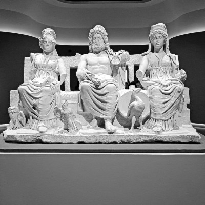公元2世纪的文物《卡皮托里尼山三主神》雕像比《十二神祇祭坛》晚了约200年。雕刻表现了罗马三位守护神朱庇特、密涅瓦和朱诺的形象。朱庇特是罗马神话中的众神之王,与希腊神话中的宙斯身份相当。卡皮托里尼是罗马城7座山丘之一,也是朱庇特的居所,居住在这里的神都有着最崇高的地位。最初陪同朱庇特居住在这里的另外两位主神并不是密涅瓦和朱诺,而是古意大利萨宾人信奉的战争之神奎里努斯和战神玛尔斯。随着希腊神祇在古罗马的流行,与赫拉和雅典娜分别对应的朱诺和密涅瓦女神取代了奎里努斯和玛尔斯,与朱庇特一起成为卡皮托里尼山丘的主神。他们的职能和象征圣物与希腊奥林匹斯山上的宙斯、赫拉和维纳斯几乎相同,具有希腊古典时期神像的典型模式,但是此时的希腊神祇在罗马已经具有了本土风格。