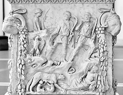 荷马史诗讲述了希腊美女海伦被特洛伊王子帕里斯从伯罗奔尼撒半岛的斯巴达诱拐到小亚细亚的特洛伊后,引来希腊联军对特洛伊十年征伐的故事。罗马的传说继续讲述了特洛伊被“木马计”破城后,守城英雄们出逃漂泊的后续。亡命天涯的英雄埃涅阿斯一路向西,最终在意大利半岛中部台伯河畔的七座山丘之间驻足,他就是公元前753年建立罗马城的罗慕洛兄弟的祖先。“母狼乳婴”的故事使得罗马城的诞生充满了神话色彩,虽然很多学者对这一则神话持怀疑态度,但雕刻于公元前6世纪的母狼铜像与文艺复兴时期增添的罗慕洛兄弟铜像一起向世世代代的人们讲述着这座城市诞生的历史。“意大利之源——古罗马文明展”上我们可以从公元124年的浮雕《祭拜玛尔斯、维纳斯和西尔瓦诺斯的圣坛》上再次看到这个古老的故事。