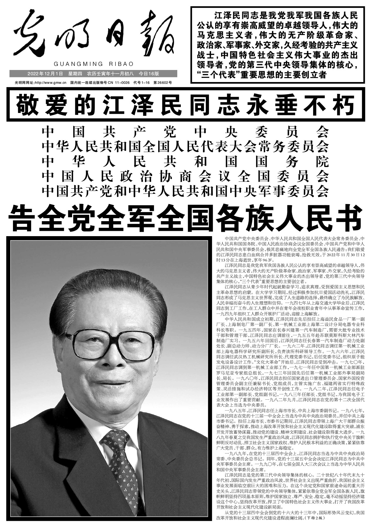 中国共产党中央委员会、中华人民共和国全国人民代表大会常务委员会、中华人民共和国国务院、中国人民政治协商会议全国委员会、中国共产党和中华人民共和国中央军事委员会,极其悲痛地向全党全军全国各族人民通告:我们敬爱的江泽民同志患白血病合并多脏器功能衰竭,抢救无效,于2022年11月30日12时13分在上海逝世,享年96岁。