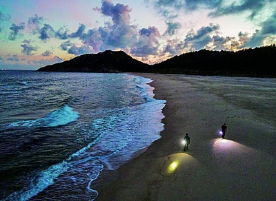 海龟孵化一般是在晚上进行,最难熬的就是漫长的等待。为了拍到小稚龟从巢穴爬出来,每晚我都跟随工作人员去漆黑的沙滩巡逻,查看巢穴的动静。直到第四个晚上,我们才看到迹象——巢穴口露出一个小小的窟窿,经验丰富的李满文激动地说:“有了,有了。”于是,大家架着灯光,打起十二分精神,静静守候在一旁,看着沙子一点点往下塌,等待第一只小稚龟的出现。“就像生小孩那样,很难说,有些好产的早早就出来了,不好产的等半天也不见动静。”蹲在巢穴旁的工作人员陈大姐调侃道。两个小时后,窟窿变得越来越大,小稚龟争先恐后地奋力向上爬。“二、四、六……”李满文抓起活蹦乱跳的小稚龟不停往筐里放,当晚这一窝总共收获100多只小稚龟,满意的笑容写在大家脸上。那一瞬间,我们觉得所有的等待和付出都是值得的。