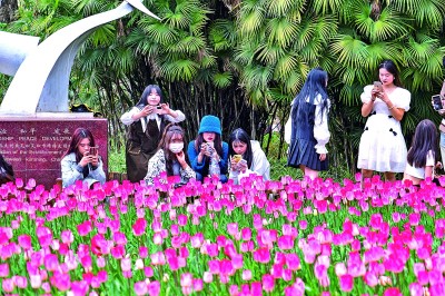 立春过后,云南省昆明市翠湖公园里的郁金香花正处于盛花期,吸引了不少市民游客前来踏春游览。图为2月5日,游客们在昆明翠湖公园观赏郁金香花。郑益摄/光明图片