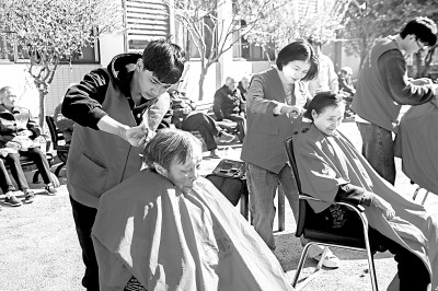 3月14日,浙江省杭州市临安区临网公益服务中心的义工在社会福利中心开展“爱心剪”志愿服务,义务为老人们理发。新华社发