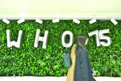 4月7日是世界卫生日,今年的主题是“人人享有健康”。图为4月6日,在瑞士日内瓦世界卫生组织总部,工作人员走过庆祝世卫组织成立75周年的装饰墙。新华社发