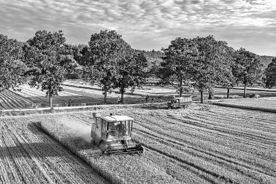 连续阴雨天过后,河南三门峡市辖区天空放晴。当地农机部门紧急调配300台联合收割机械,当天抢收成熟小麦3.62万亩,确保小麦颗粒归仓。图为三门峡市灵宝西阎乡西吕店村麦田里,农机手操作大型收割机收割小麦。杜杰摄/光明图片
